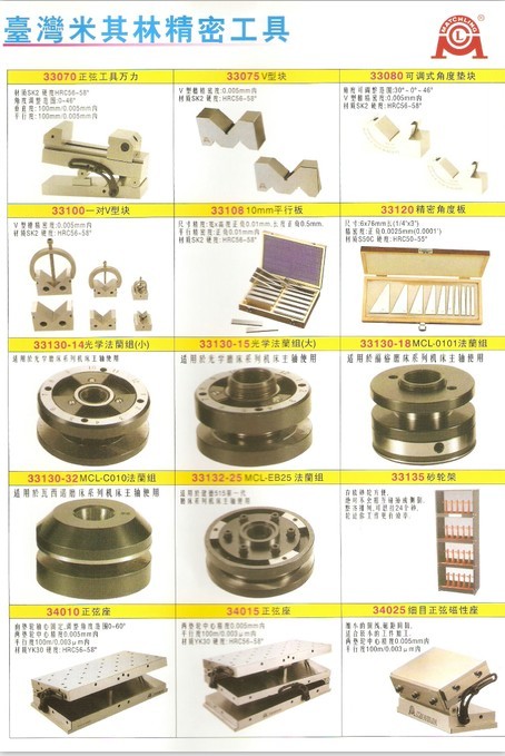 台湾米其林小型工具万力. 工具万力MCL-A20、MCL-A25、MCL-A30、MCL-A40精密工具万力MCL-VV30、MCL-VV40、MCL-VV50、MCL-VV60. 微调正弦万力. 台湾米其林正弦工具万力. V型块. 可调式角度垫块. 精密角度板. 台湾米其林精密直角座. 一对V型块. 平行垫块. 米其林平行板. 精密角度板. 角度垫块. 法兰MCL-250.MCL-EN350. 光学法兰组. 砂轮架. 粗/细目正弦磁性座MCL-MSP47S、MCL-MSP66S、MCL-D6060. 微调/双向正弦磁性座MCL-D6060S. 无段旋转磁盘. 米其林粗/细目圆形磁盘. 硬磁盘. 导磁块. 方型磁性块. 磁性V型座. 台湾米其林粗/细目回转电磁性座.细目磁盘MCL-1530B、MCL-1535B. 薄型磁盘. 粗/细目电磁盘. 强力电磁盘. 磁盘控制器.圆型/笔型/隧道脱磁器. 强力脱磁器. 磁性油槽除粉器. 米其林杠杆磁性座. 喷雾/喷水/喷油磁性座. 磁性吊吸盘. 米其林真空吸盘.